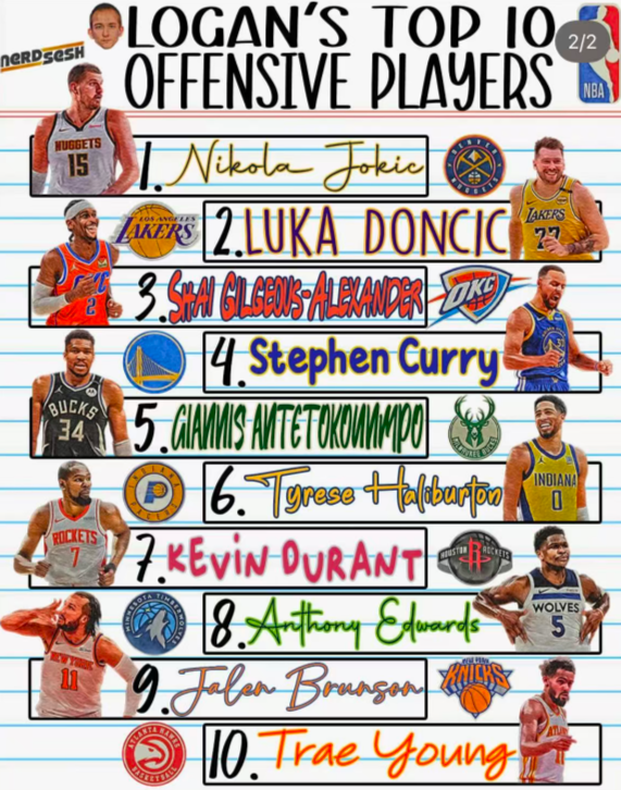 罗根评选的进攻前十:1.尼古拉-约基奇、2.卢卡-东契奇、3.亚历山大、4.斯蒂芬-库里、5.扬尼斯-阿德托昆博、6.泰雷斯-哈利伯顿、7.凯文-杜兰特、8.安东尼-爱德华兹、9.杰伦-布伦森、10.特雷杨;