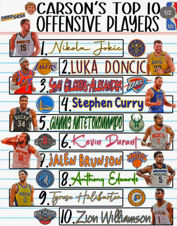 卡森评选的联盟前十进攻超巨:1.尼古拉-约基奇、2.卢卡-东契奇、3.亚历山大、4.斯蒂芬-库里、5.扬尼斯-阿德托昆博、6.凯文-杜兰特、7.杰伦-布伦森、8.安东尼-爱德华兹、9.泰雷斯-哈利伯顿、9.锡安-威廉森;